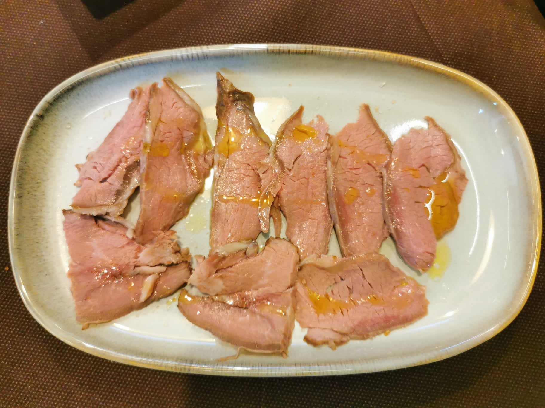 Punta di petto di vitellone cotta a bassa temperatura e poi grigliata con un rub di senape e paprika.