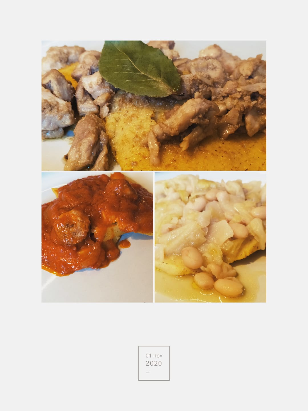 Polenta a fette (felle) servita con condimenti a scelta tra: spezzatino di maiale, ragù di salsiccia, friarielli e salsiccia, verza e fagioli, erbette di campo.